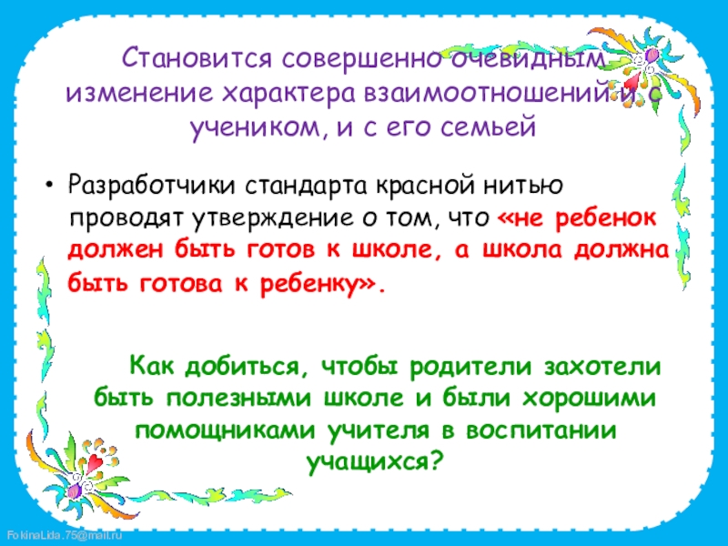 Разработчики стандарта красной нитью проводят утверждение о том, что «не ребенок должен быть готов к школе, а школа должна быть готова к ребенку».