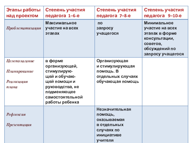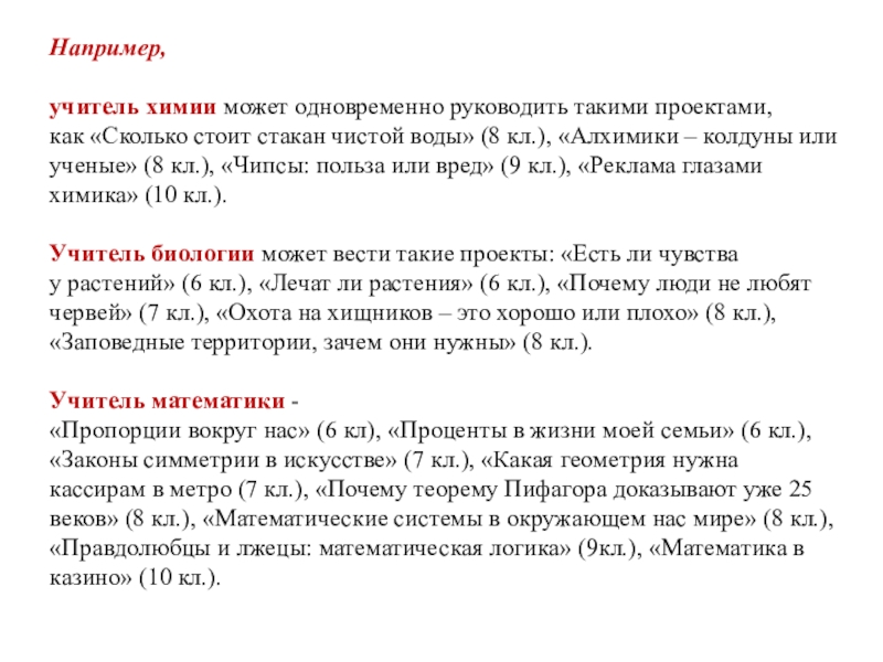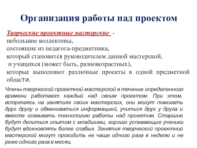 Члены творческой проектной мастерской в течение определенного времени работают каждый над своим проектом. При этом, встречаясь на занятиях своих мастерских, они могут помогать друг другу и обмениваться информацией, учиться друг у друга и вместе осваивать технологию работы над проектом. Старшие будут делиться опытом с младшими, хорошо успевающие ученики будут вдохновлять более слабых. Занятия творческой проектной мастерской могут проходить не чаще одного раза в неделю и не реже одного раза в месяц.
