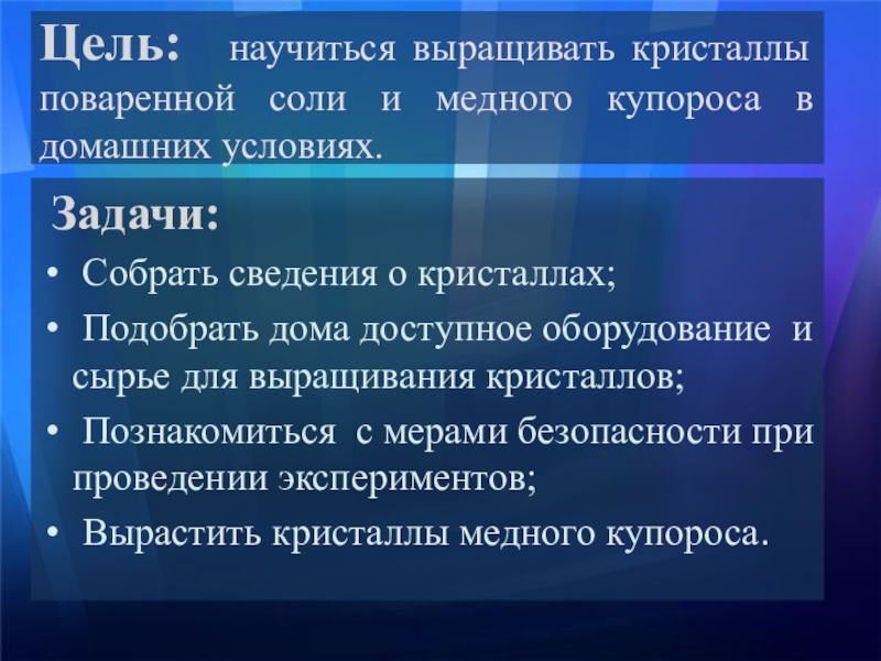 Подобрать дома доступное оборудование и сырье для выращивания кристаллов;