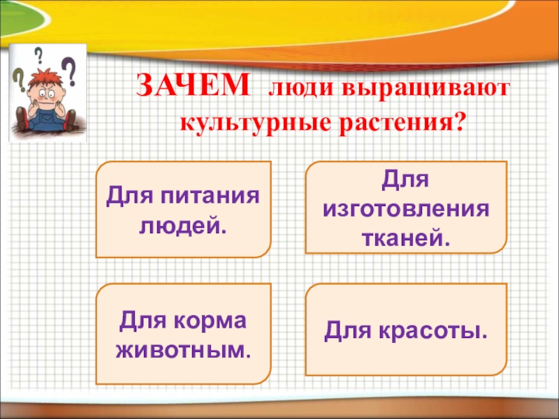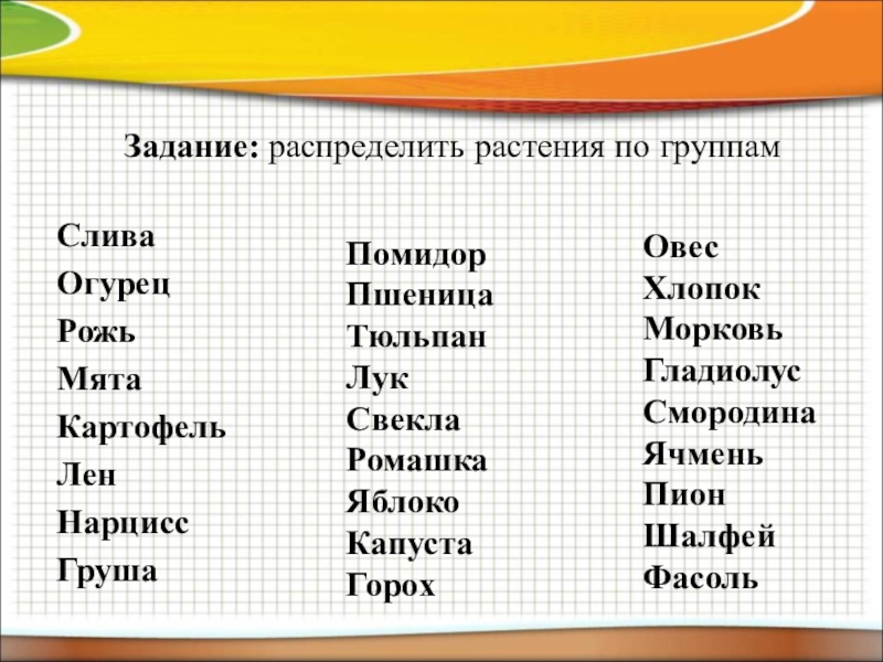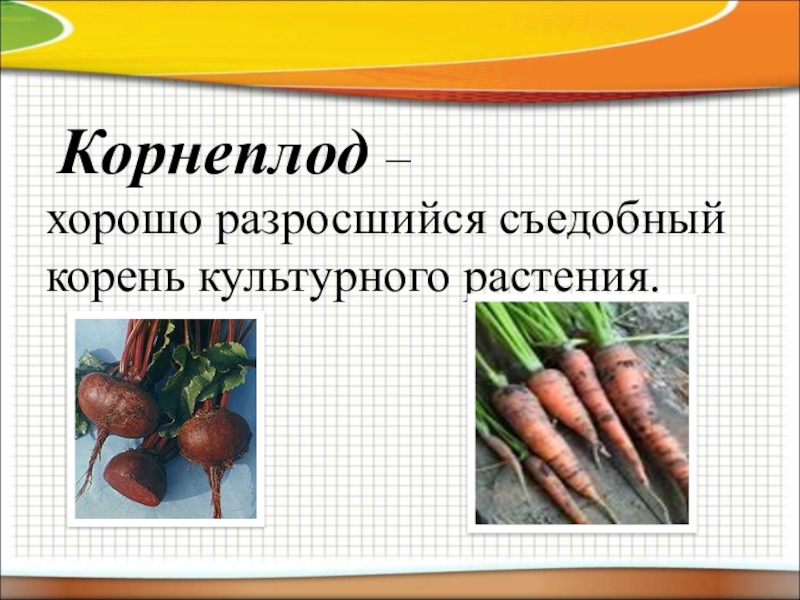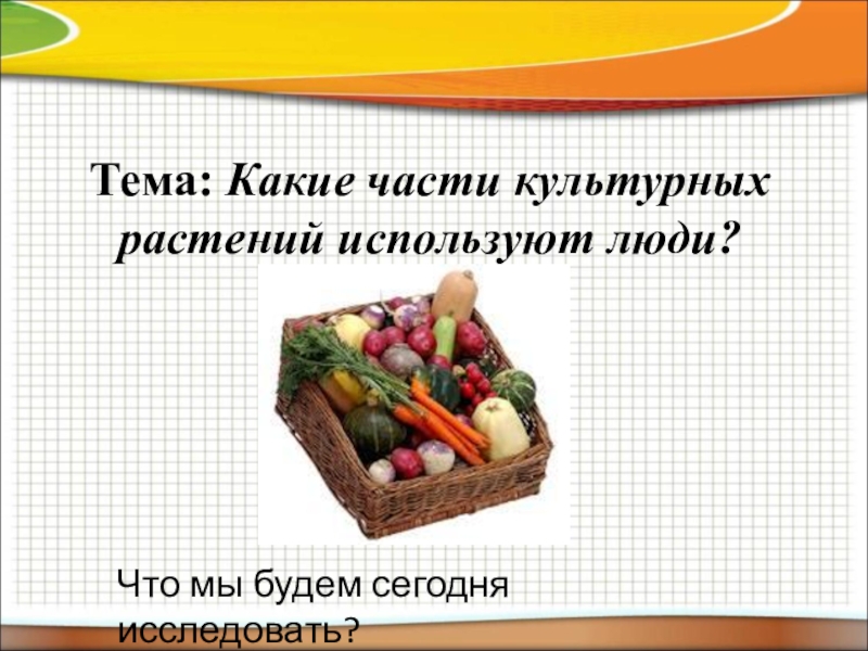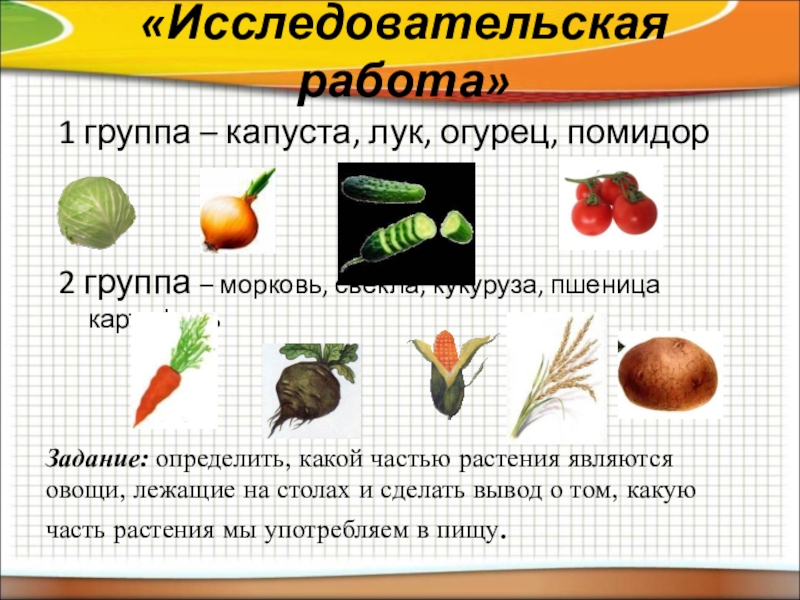 Задание: определить, какой частью растения являются овощи, лежащие на столах и сделать вывод о том, какую часть растения мы употребляем в пищу.