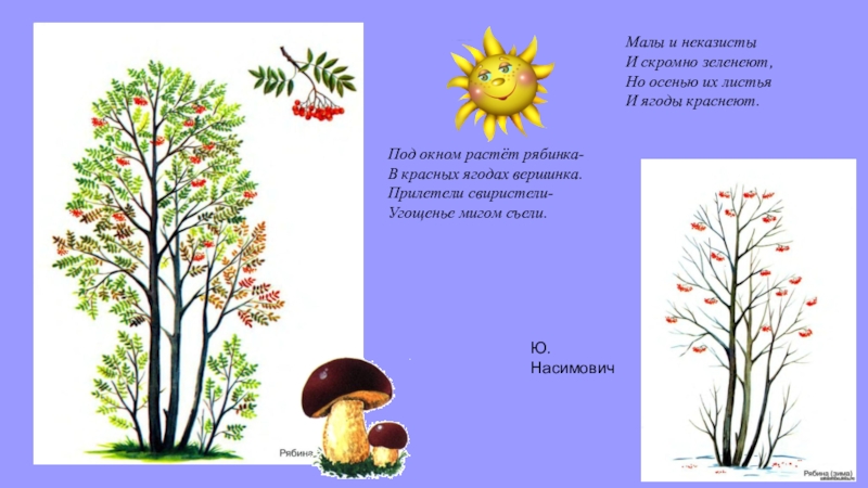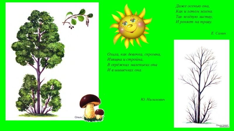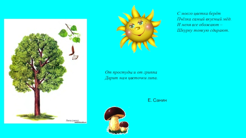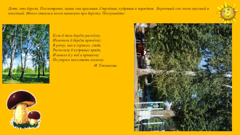 Дети, это береза. Посмотрите, какая она красивая. Стройная, кудрявая и нарядная. Березовый сок очень вкусный и полезный. Много стихов и песен написано про березку. Послушайте: