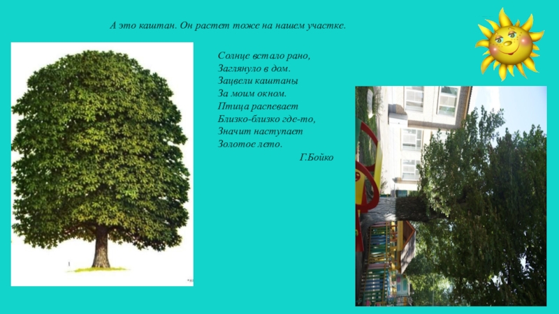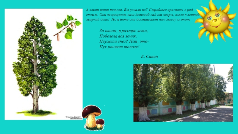 А этот наши тополя. Вы узнали их? Стройные красавцы в ряд стоят. Они защищают наш детский сад от жары, пыли в летний жаркий день! Но в июне они доставляют нам массу хлопот.