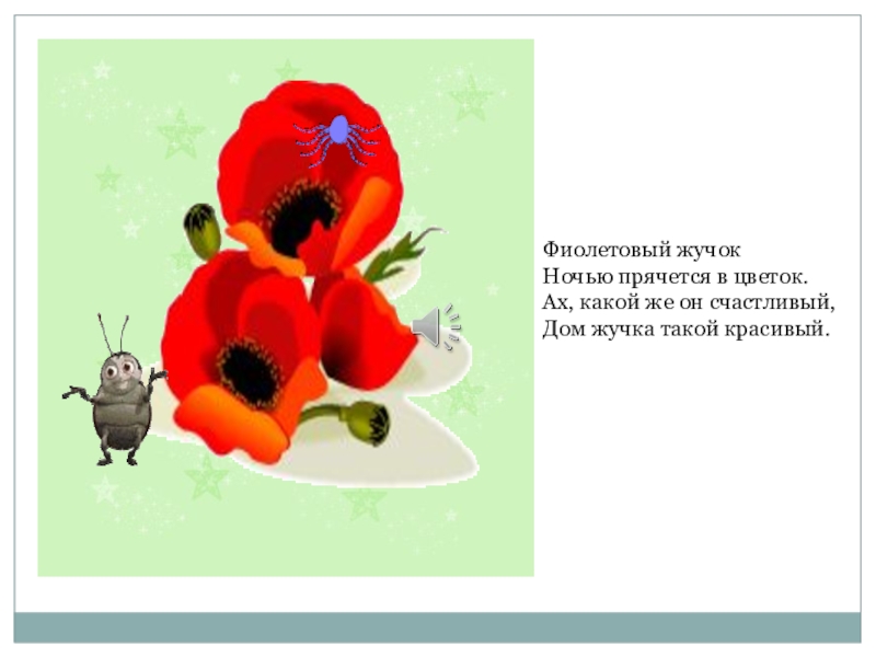 Фиолетовый жучокНочью прячется в цветок.Ах, какой же он счастливый,Дом жучка такой красивый.