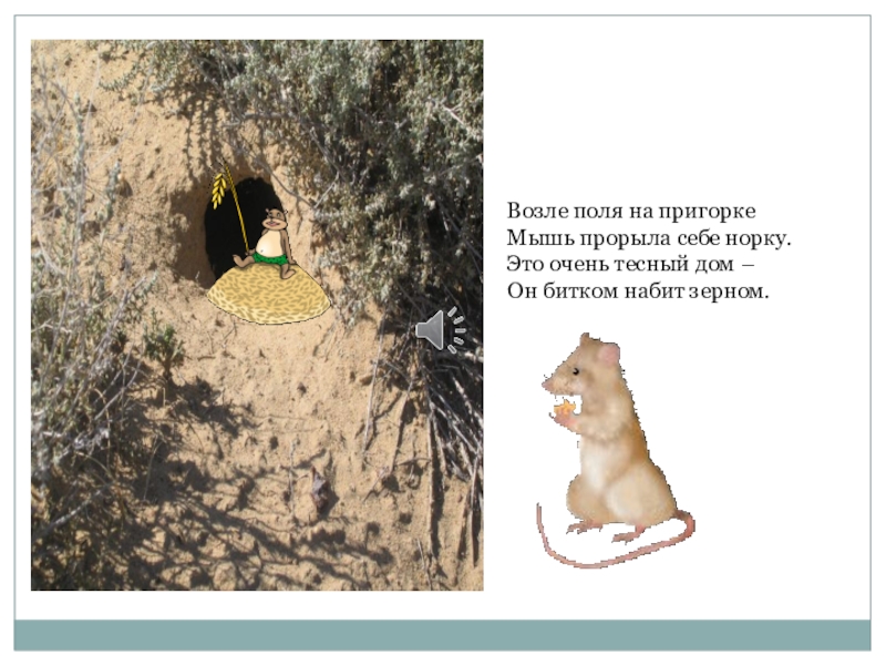 Возле поля на пригоркеМышь прорыла себе норку.Это очень тесный дом –Он битком набит зерном.