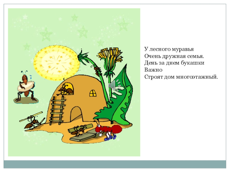 У лесного муравьяОчень дружная семья.День за днем букашкиВажноСтроят дом многоэтажный.