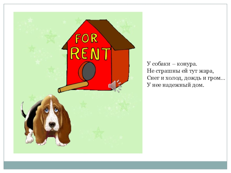 У собаки – конура. Не страшны ей тут жара,Снег и холод, дождь и гром…У нее надежный дом.