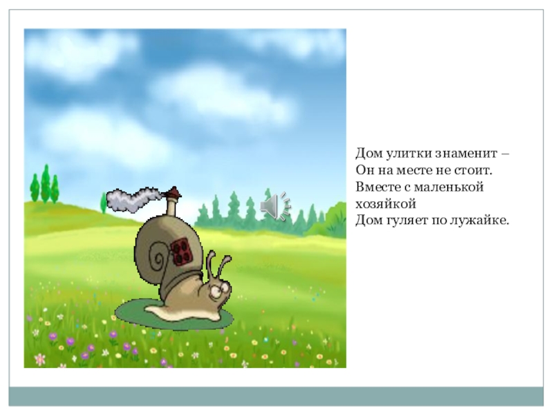 Дом улитки знаменит –Он на месте не стоит. Вместе с маленькой хозяйкойДом гуляет по лужайке.