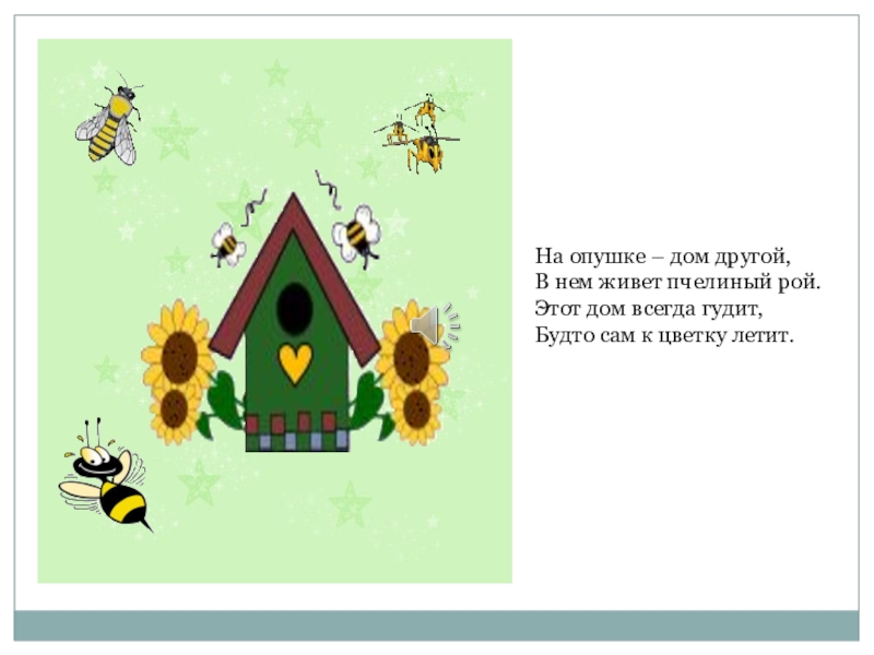 На опушке – дом другой,В нем живет пчелиный рой. Этот дом всегда гудит, Будто сам к цветку