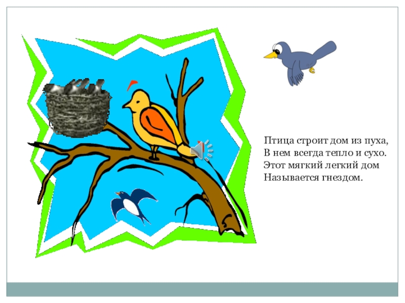 Птица строит дом из пуха,В нем всегда тепло и сухо.Этот мягкий легкий домНазывается гнездом.