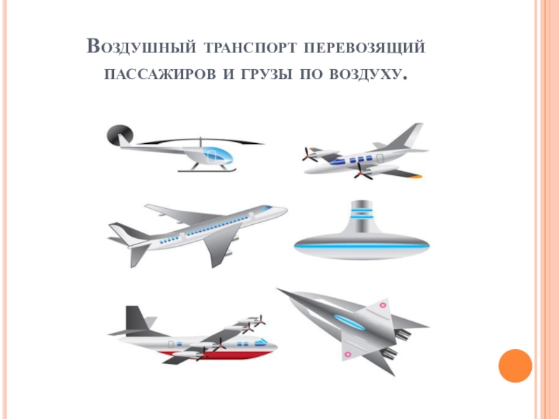 Слайд 34Воздушный транспорт перевозящий пассажиров и грузы по воздуху.