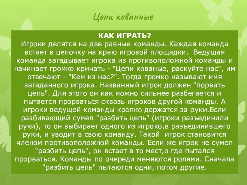 Игроки делятся на две равные команды. Каждая команда встает в цепочку на краю игровой площадки. Ведущая команда загадывает игрока из противоположной команды и начинает громко кричать - "Цепи кованые, раскуйте нас", им отвечают - "Кем из нас?". Тогда громко называют имя загаданного игрока. Названный игрок должен "порвать цепь". Для этого он как можно сильнее разбегается и пытается прорваться сквозь игроков другой команды. А игроки ведущей команды крепко держатся за руки.Если разбивающий сумел "разбить цепь" (игроки разъединили руки), то он выбирает одного из игроко,в разъединившего руки, и уводит в свою команду. Такой игрок становится членом противоположной команды. Если же игрок не сумел "разбить цепь", он встает в то мест,о где пытался прорваться. Команды по очереди меняются ролями. Сначала "разбить цепь" пытаются одни, потом другие.