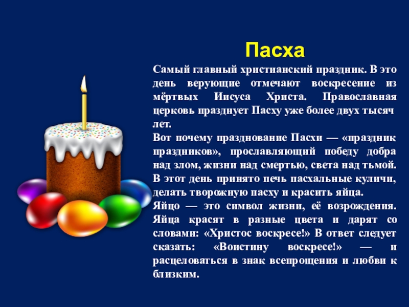 Вот почему празднование Пасхи — «праздник праздников», прославляющий победу добра над злом, жизни над смертью, света над тьмой. В этот день принято печь пасхальные куличи, делать творожную пасху и красить яйца.