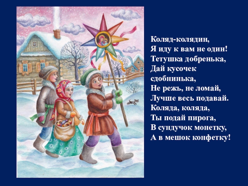 специальные песни с пожеланиями богатого урожая, здоровья, согласия в семье. Во время святок никто не работал. С этим временем связано много веселья, обычаев. Наши предки верили, что в это время силы добра и света побеждают силы зла и тьмы. Этот праздник считался колдовским, волшебным временем. Обычай «кликать коляду» был известен по всей Руси: под окном каждого дома пелись колядки с пожеланиями всего хорошего, а хозяева одаривали колядующих пряниками, пирогами, сладостями, мелкими денежками.
