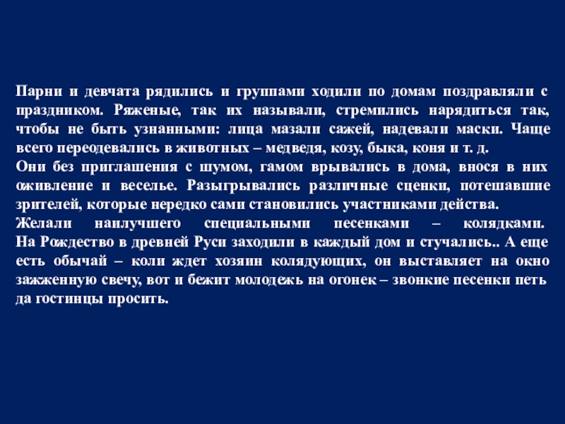 праздником. Ряженые, так их называли, стремились нарядиться так, чтобы не быть узнанными: лица мазали сажей, надевали маски. Чаще всего переодевались в животных – медведя, козу, быка, коня и т. д.