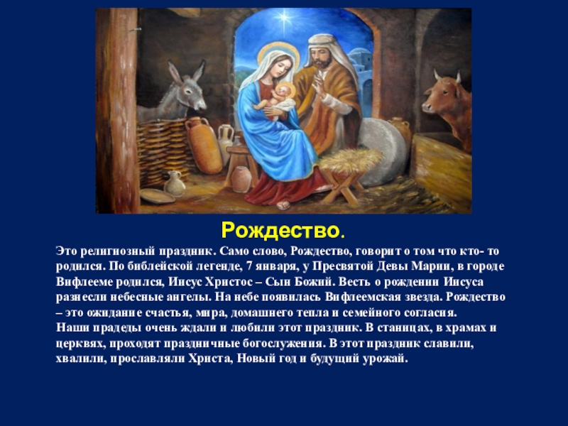 то родился. По библейской легенде, 7 января, у Пресвятой Девы Марии, в городе Вифлееме родился, Иисус Христос – Сын Божий. Весть о рождении Иисуса разнесли небесные ангелы. На небе появилась Вифлеемская звезда. Рождество – это ожидание счастья, мира, домашнего тепла и семейного согласия.