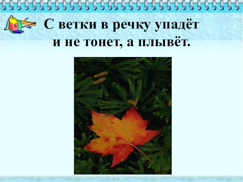 Слайд 9С ветки в речку упадёт и не тонет, а плывёт.