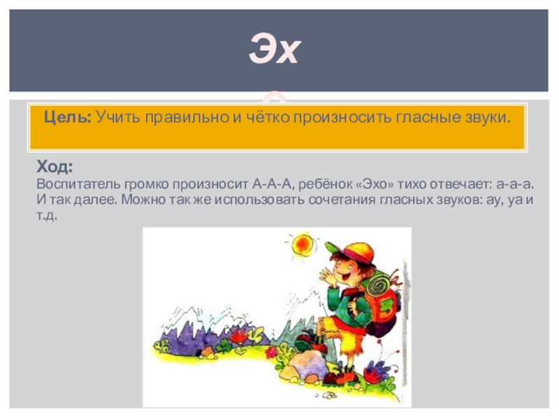 Цель: Учить правильно и чётко произносить гласные звуки.