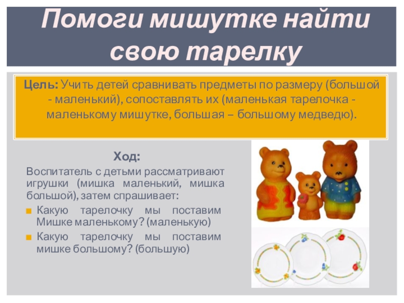 Цель: Учить детей сравнивать предметы по размеру (большой - маленький), сопоставлять их (маленькая тарелочка - маленькому мишутке, большая – большому медведю).