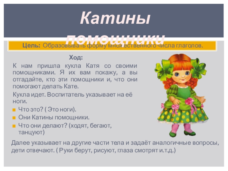 Далее указывает на другие части тела и задаёт аналогичные вопросы, дети отвечают. ( Руки берут, рисуют, глаза смотрят и.т.д.)