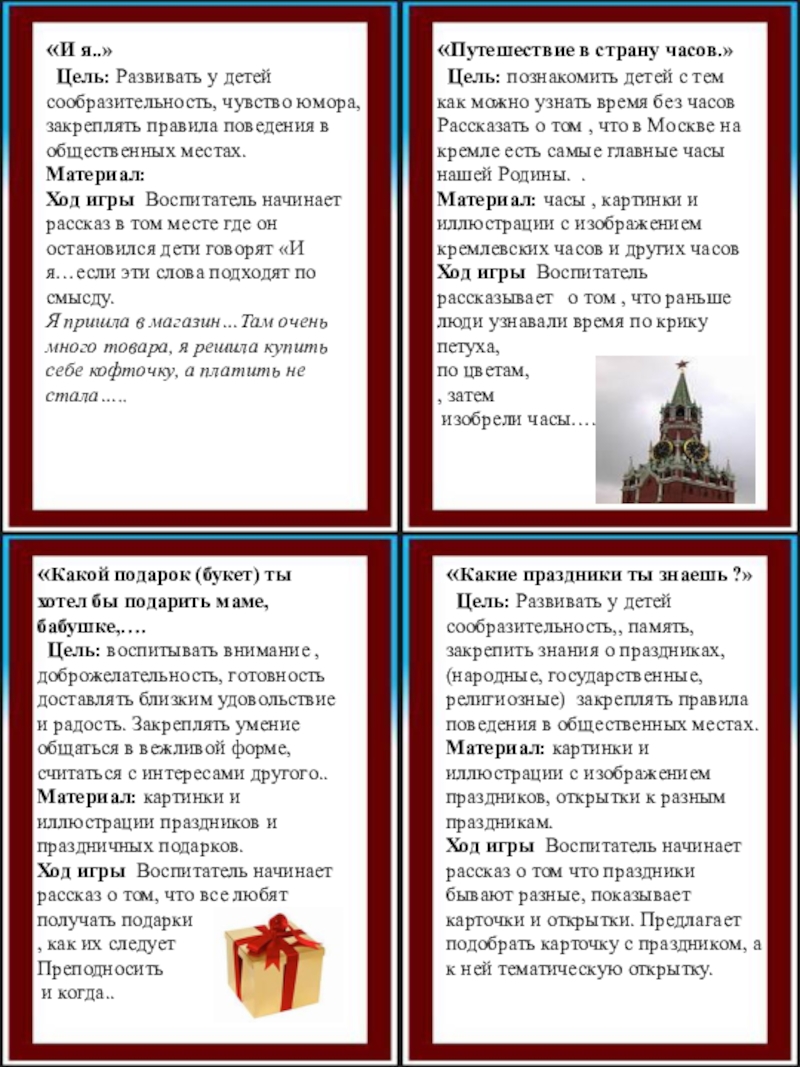 Цель: Развивать у детей сообразительность,, память, закрепить знания о праздниках, (народные, государственные, религиозные) закреплять правила поведения в общественных местах.