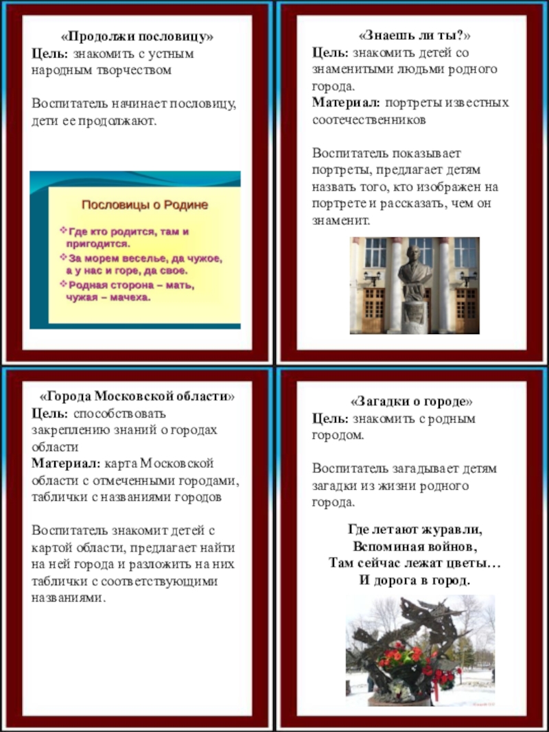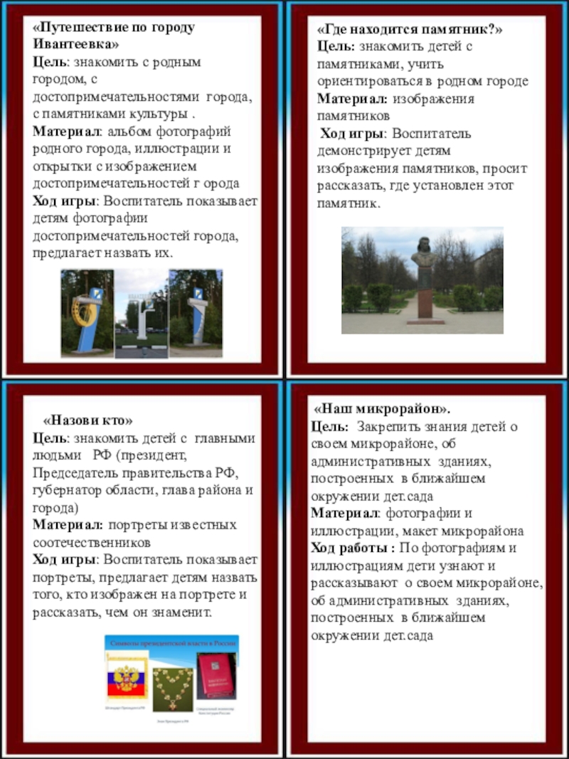 Ход игры: Воспитатель демонстрирует детям изображения памятников, просит рассказать, где установлен этот памятник.