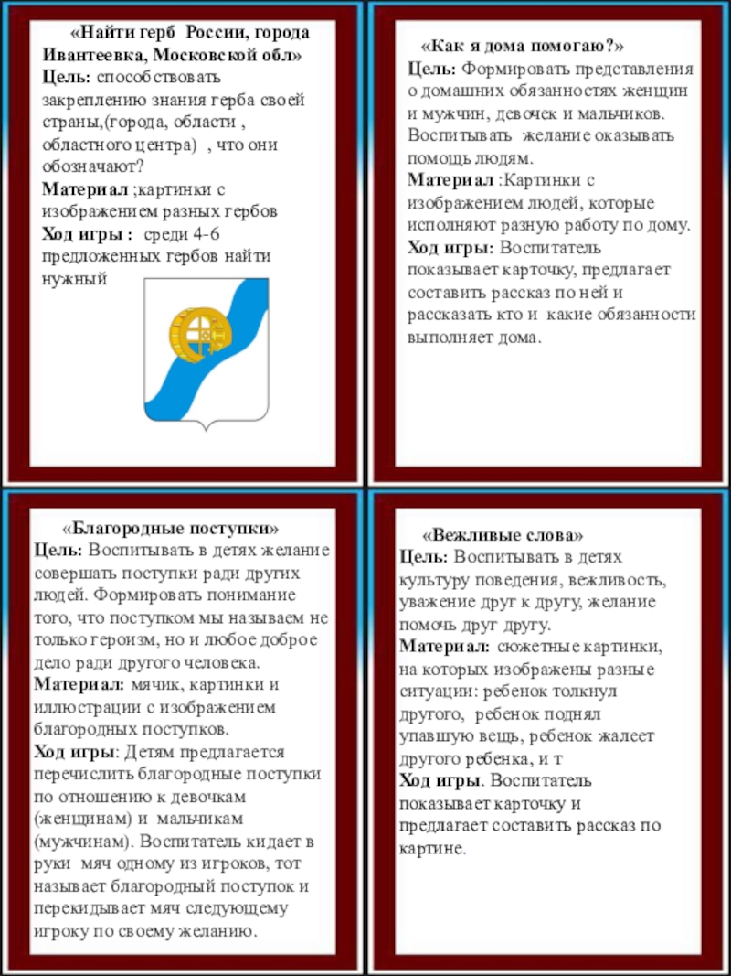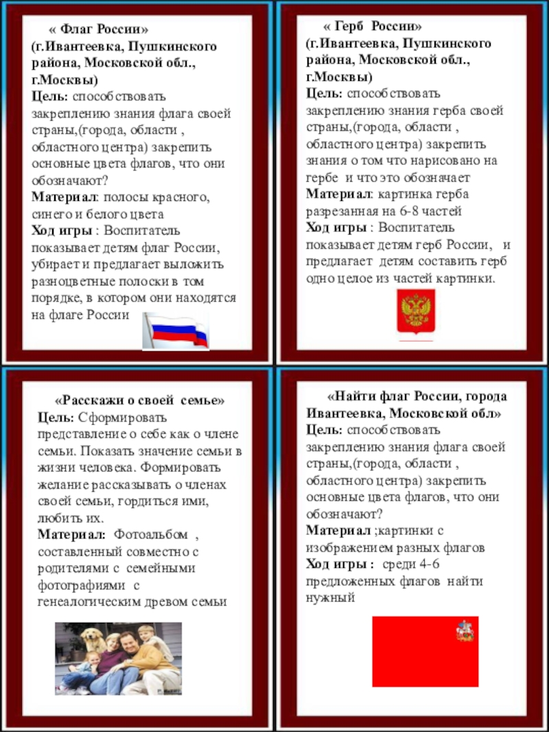 Ход игры : Воспитатель показывает детям герб России, и предлагает детям составить герб одно целое из частей картинки.