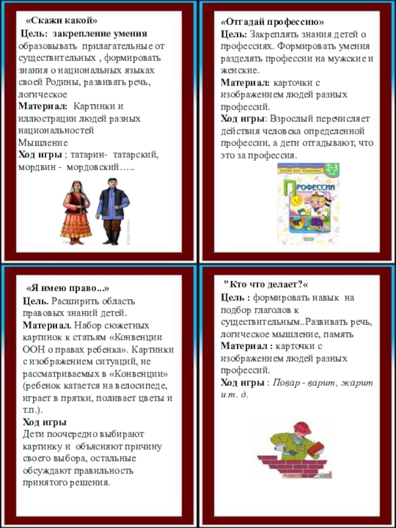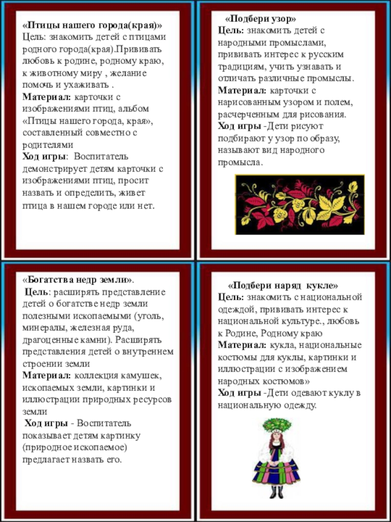 Правила игры: В игру могут играть от 2-х до 10 человек. Все карточки выкладываются на стол рубашкой вверх, перемешиваются, каждый игрок набирает по 4 карточки. Остальные, оставшиеся находятся на столе в стороне – это базар. Игра начинается с карточки, имеющей по двум противоположным сторонам одинаковое изображение народного костюма. Если же таких изображений у нескольких человек, то играющие используют считалку, и право первого хода получает тот, кого выбрали по считалке.