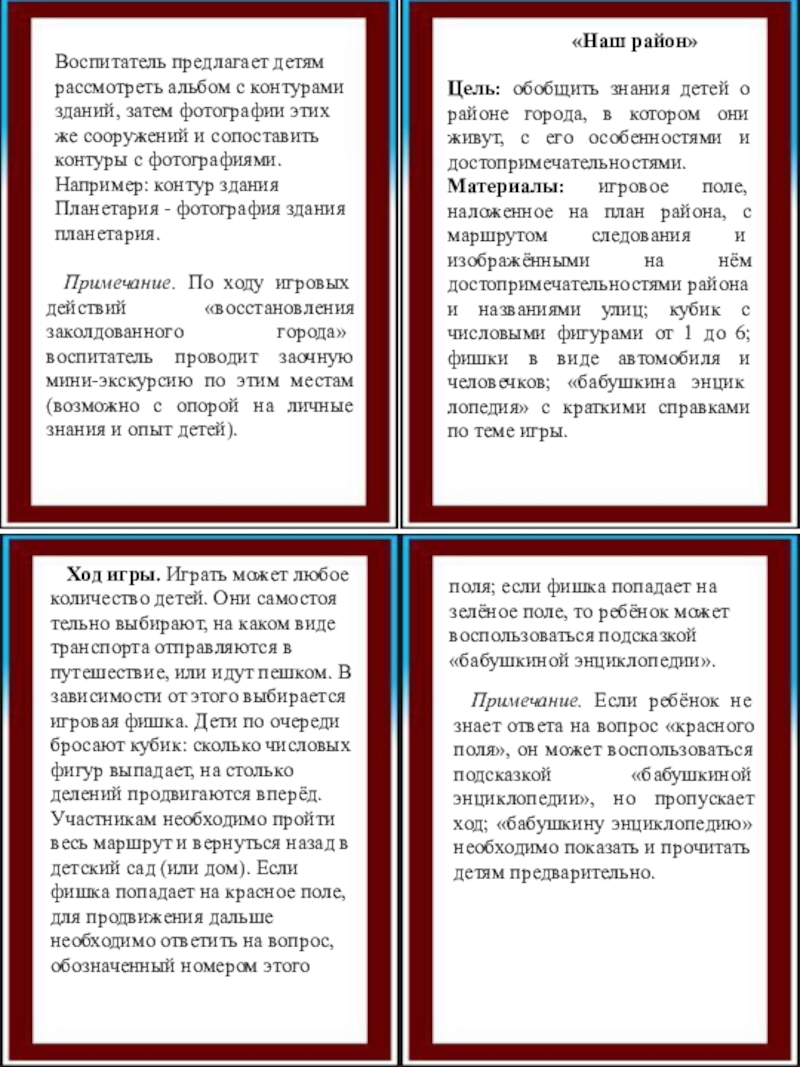 Материалы: игровое поле, наложенное на план района, с маршрутом следования и изображёнными на нём достопримечательностями района и названиями улиц; кубик с числовыми фигурами от 1 до 6; фишки в виде автомобиля и человечков; «бабушкина энциклопедия» с краткими справками по теме игры.