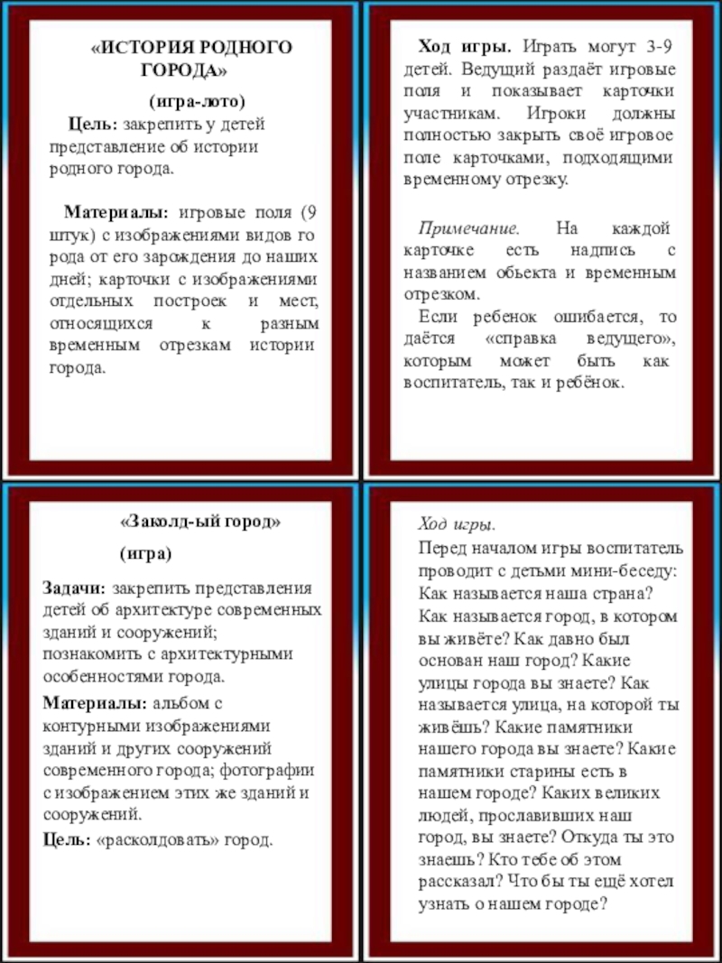 Материалы: игровое поле, где изображены дороги, улицы, скверы, парки. На красных полях — силуэты хорошо известных в городе зданий, памятников и других сооружений; карточки с вопросами и заданиями; кубик; фишки по количеству играющих.