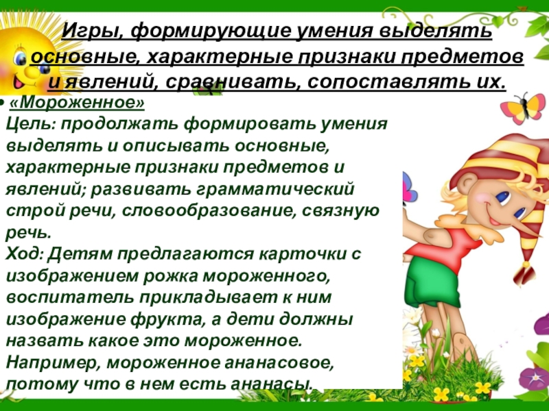 Ход: Детям предлагаются карточки с изображением рожка мороженного, воспитатель прикладывает к ним изображение фрукта, а дети должны назвать какое это мороженное. Например, мороженное ананасовое, потому что в нем есть ананасы.