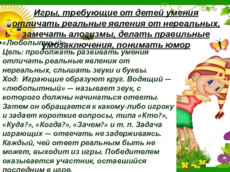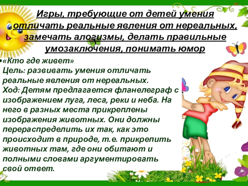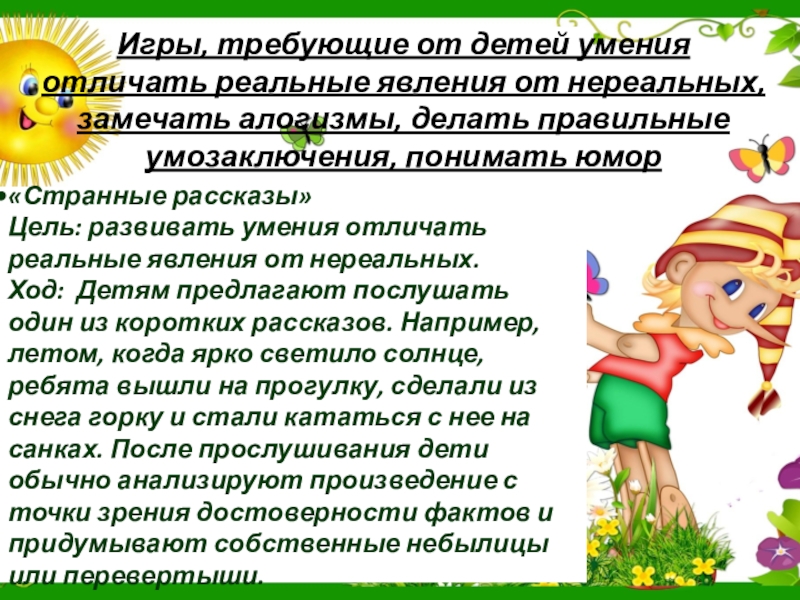 Игры, требующие от детей умения отличать реальные явления от нереальных, замечать алогизмы, делать правильные умозаключения, понимать юмор