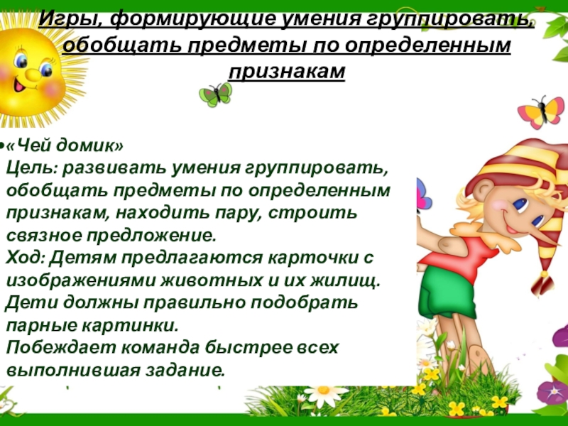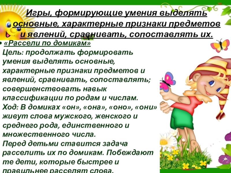 Цель: продолжать формировать умения выделять основные, характерные признаки предметов и явлений, сравнивать, сопоставлять; совершенствовать навык классификации по родам и числам.