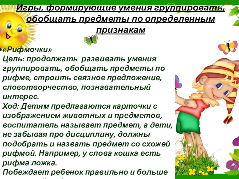 Ход: Детям предлагают послушать один из коротких рассказов. Например, летом, когда ярко светило солнце, ребята вышли на прогулку, сделали из снега горку и стали кататься с нее на санках. После прослушивания дети обычно анализируют произведение с точки зрения достоверности фактов и придумывают собственные небылицы или перевертыши.