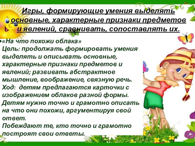 Цель: продолжать формировать умения выделять и описывать основные, характерные признаки предметов и явлений; развивать абстрактное мышление, воображение, связную речь.