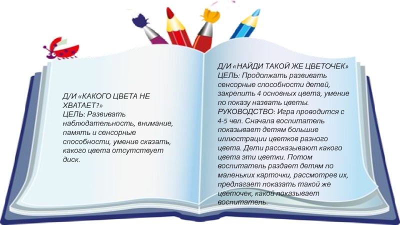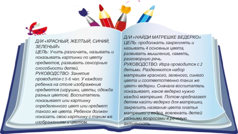 ЦЕЛЬ: формировать у детей умение различать основные цвета: красный, жёлтый, зелёный и синий,