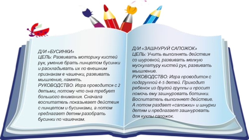 РУКОВОДСТВО: Игра проводится с подгруппой 4-5 детей. Приходит ребенок из другой группы и просит помочь ему зашнуровать ботинки. Воспитатель выполняет действие. А потом раздает «сапожки» и шнурки детям и предлагает зашнуровать для куклы сапожок.