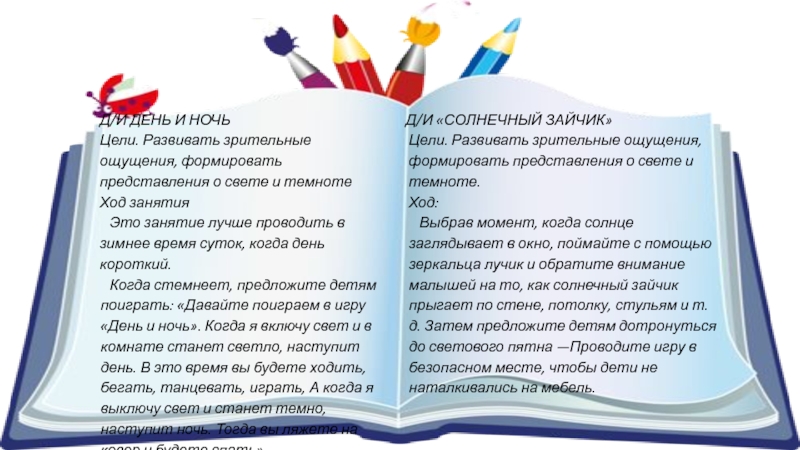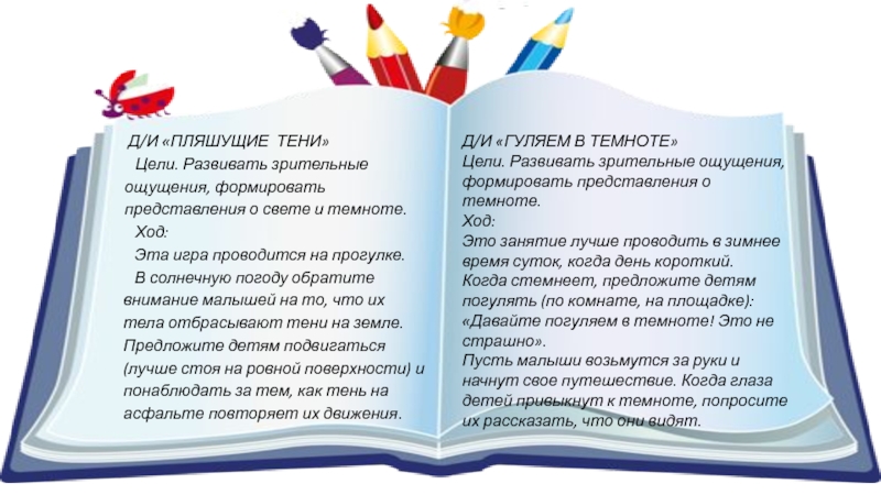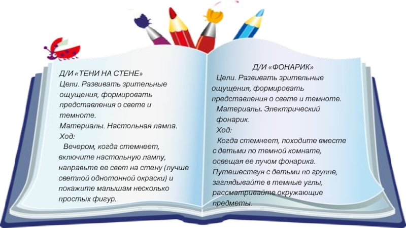 Цели. Развивать зрительные ощущения, формировать представления о свете и темноте.