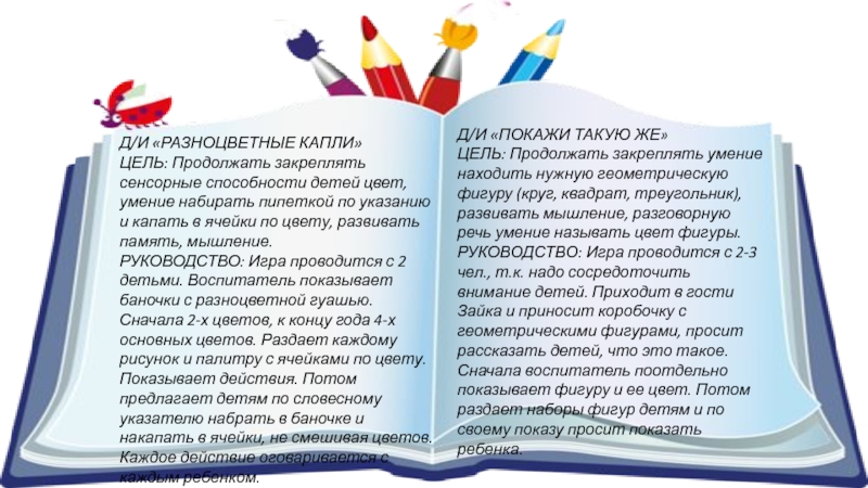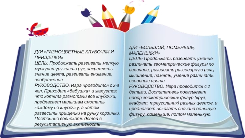 РУКОВОДСТВО: Игра проводится с 2 детьми. Воспитатель показывает набор геометрических фигур (круг, квадрат, треугольник) разных цветов, и предлагает показать сначала большую фигуру, поменьше, потом маленькую.