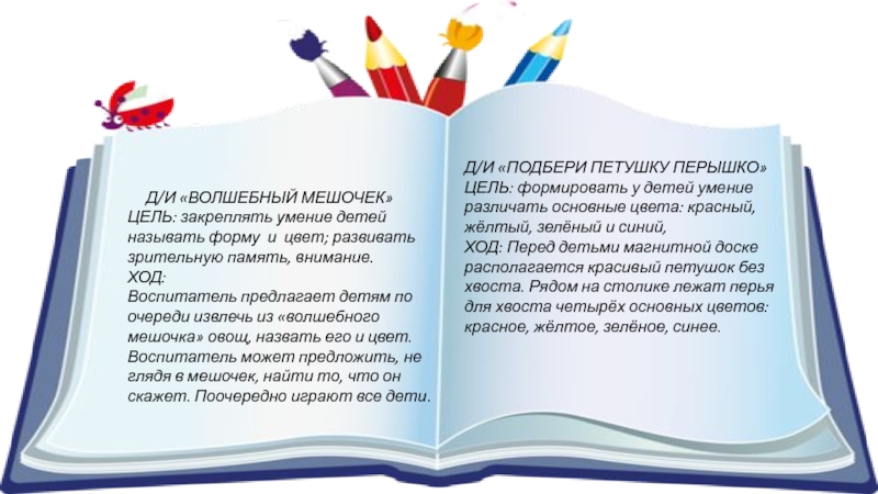 ХОД: Перед детьми магнитной доске располагается красивый петушок без хвоста. Рядом на столике лежат перья для хвоста четырёх основных цветов: красное, жёлтое, зелёное, синее.