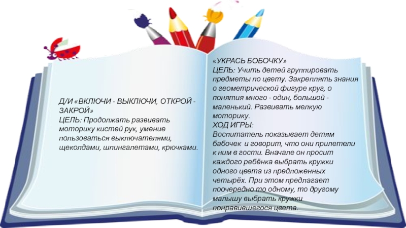 Воспитатель показывает детям бабочек и говорит, что они прилетели к ним в гости. Вначале он просит каждого ребёнка выбрать кружки одного цвета из предложенных четырёх. При этом предлагает поочередно то одному, то другому малышу выбрать кружки понравившегося цвета.