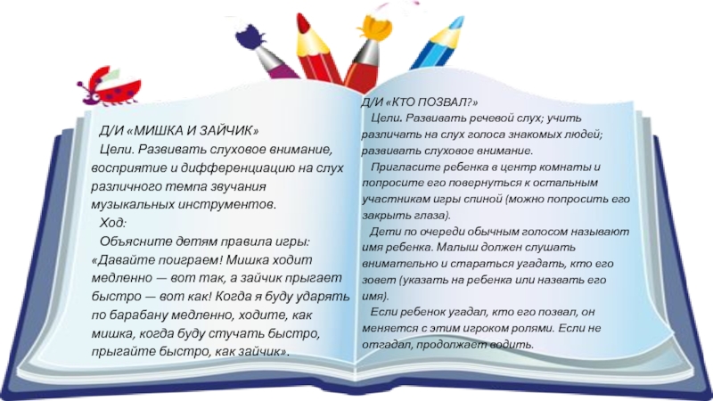 Дети по очереди обычным голосом называют имя ребенка. Малыш должен слушать внимательно и стараться угадать, кто его зовет (указать на ребенка или назвать его имя).