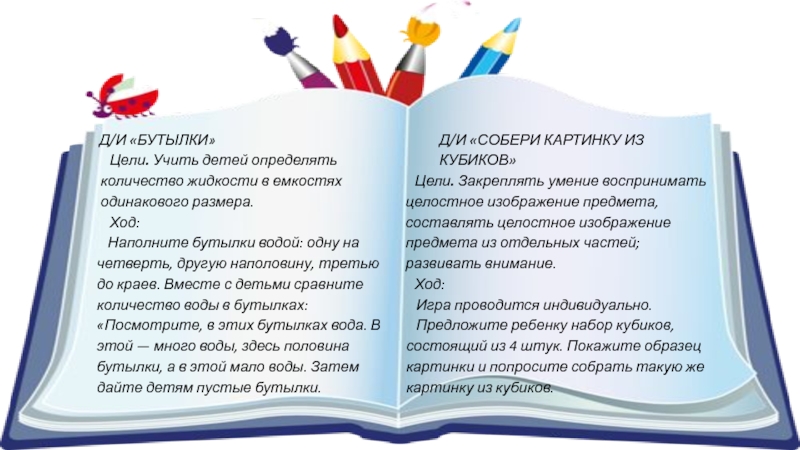 Цели. Закреплять умение воспринимать целостное изображение предмета, составлять целостное изображение предмета из отдельных частей; развивать внимание.