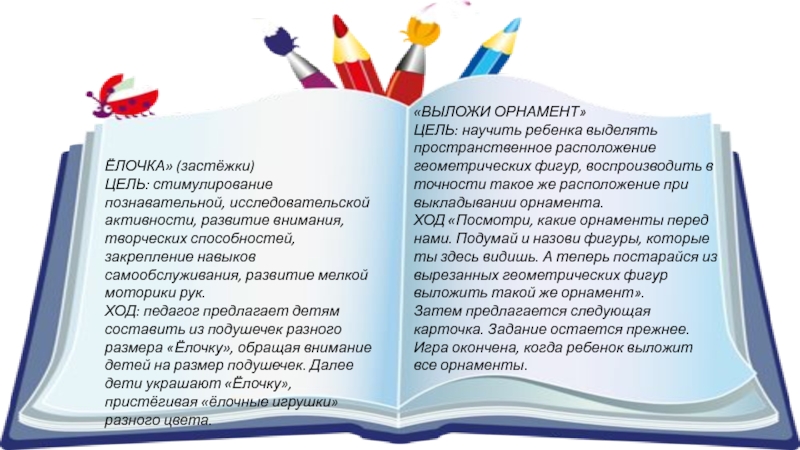 ЦЕЛЬ: научить ребенка выделять пространственное расположение геометрических фигур, воспроизводить в точности такое же расположение при выкладывании орнамента.