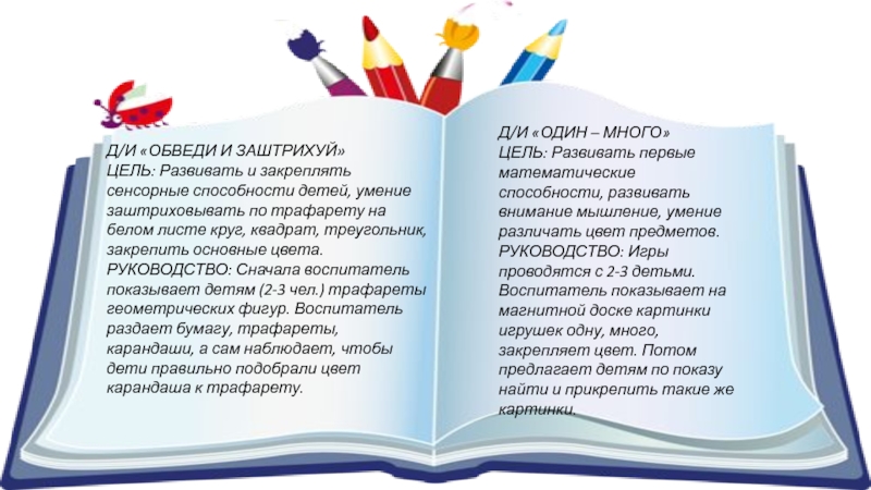 РУКОВОДСТВО: Игра проводится с подгруппой детей в 4-5 чел. Воспитатель сначала показывает геометрические фигуры, называет их и показывает детям, как надо их вставлять в трафареты. Во время игры постоянно закреплять название фигур - круг, квадрат, треугольник.