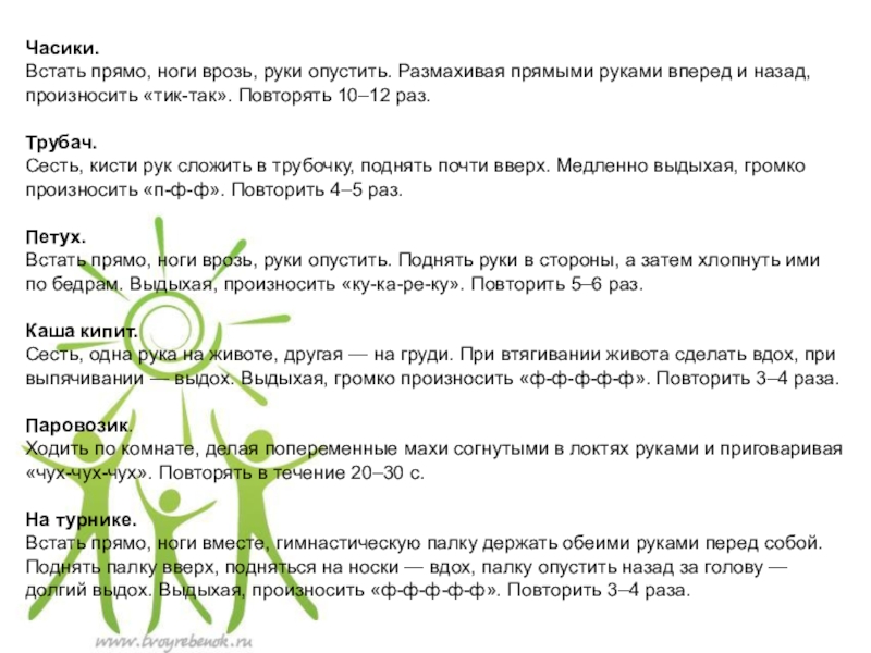 Встать прямо, ноги врозь, руки опустить. Размахивая прямыми руками вперед и назад, произносить «тик-так». Повторять 10–12 раз.