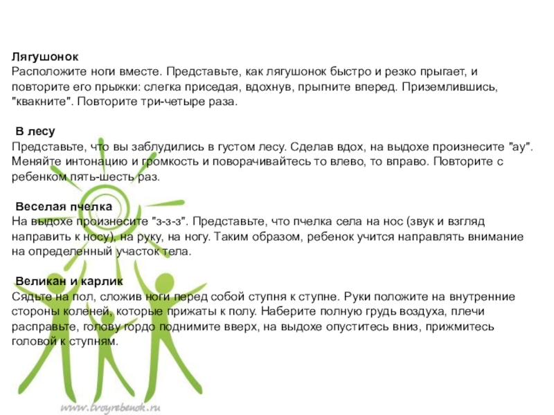 Расположите ноги вместе. Представьте, как лягушонок быстро и резко прыгает, и повторите его прыжки: слегка приседая, вдохнув, прыгните вперед. Приземлившись, "квакните". Повторите три-четыре раза.