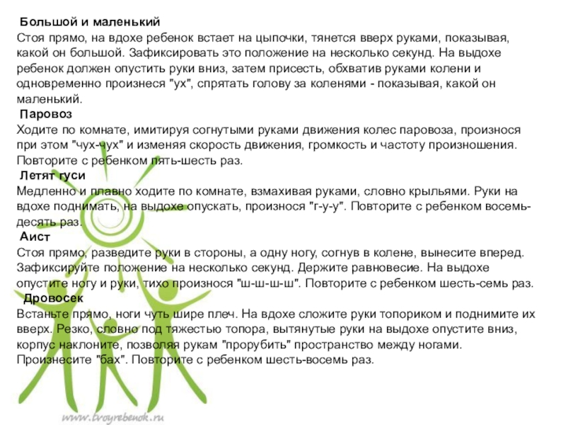 Ходить по комнате, делая попеременные махи согнутыми в локтях руками и приговаривая «чух-чух-чух». Повторять в течение 20–30 с.