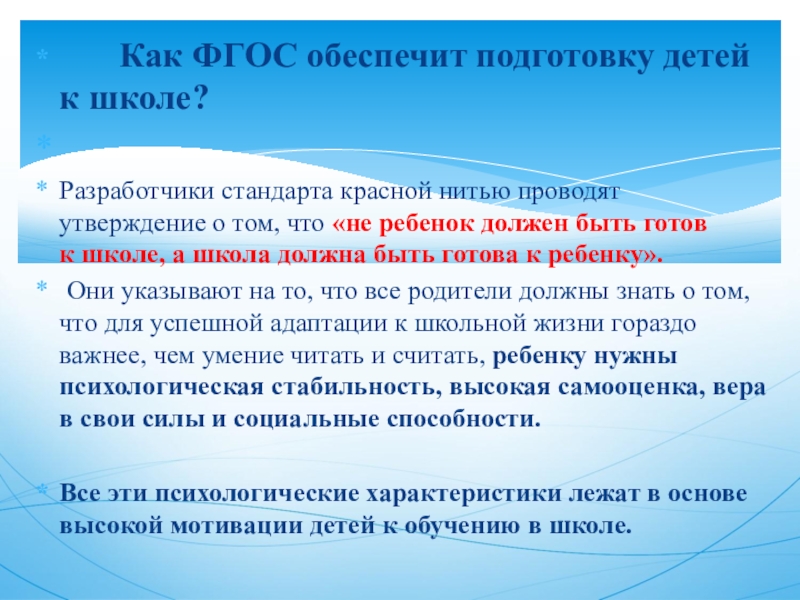 Разработчики стандарта красной нитью проводят утверждение о том, что «не ребенок должен быть готов к школе, а школа должна быть готова к ребенку».