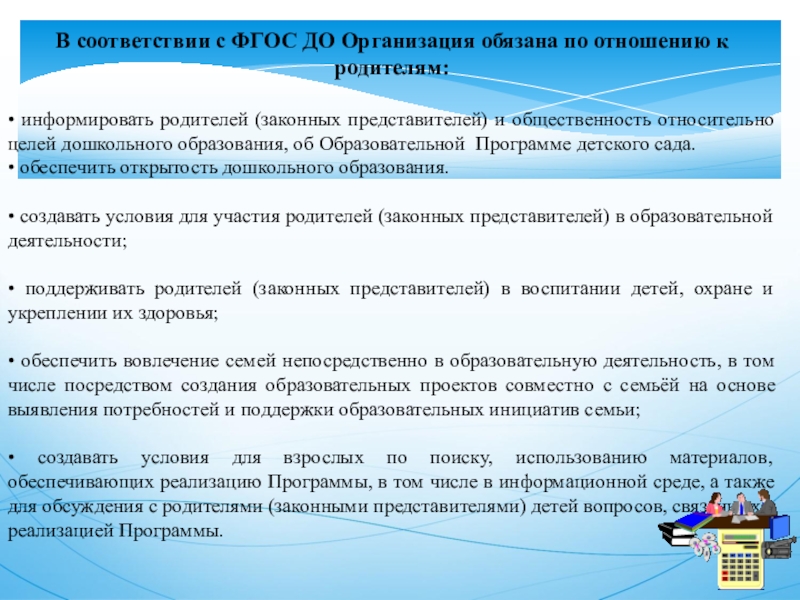 Слайд 11В соответствии с ФГОС ДО Организация обязана по отношению к родителям: