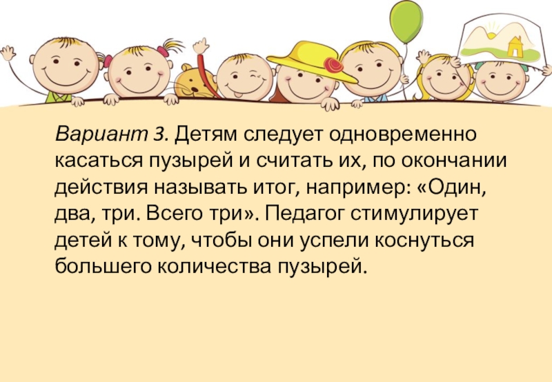 Слайд 9 Вариант 3. Детям следует одновременно касаться пузырей и считать